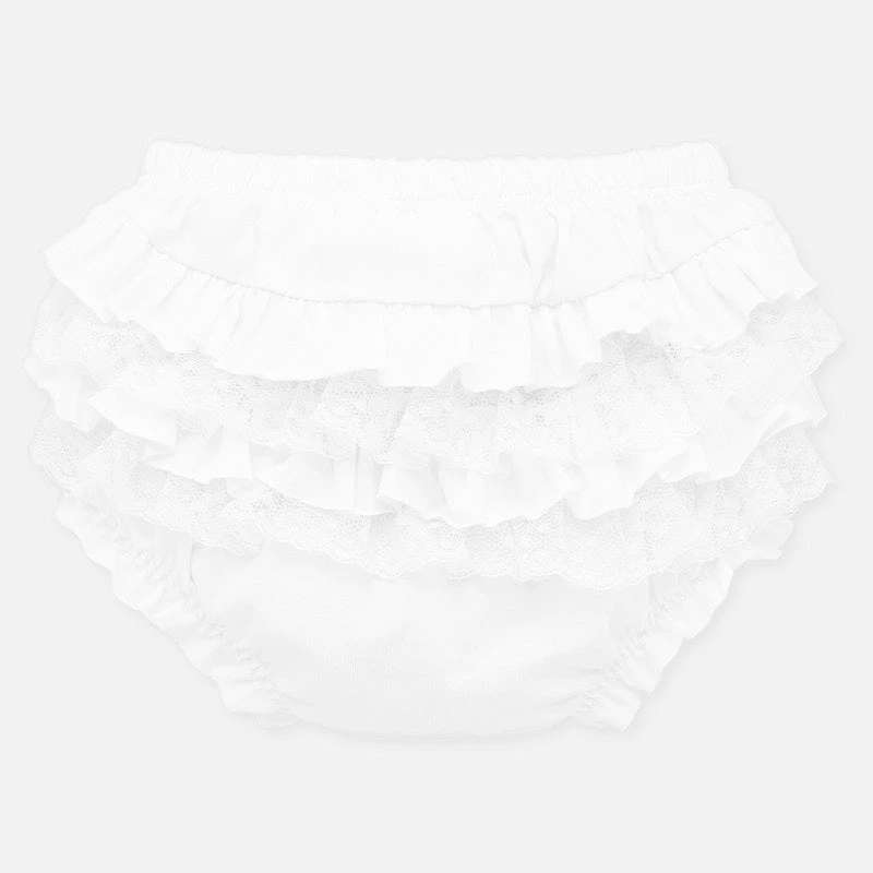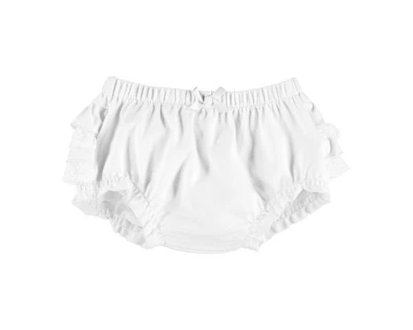 White undergarment made from soft elasticated cotton fabric. Decorative elements: lace, bow applique, decorative ruffles.
