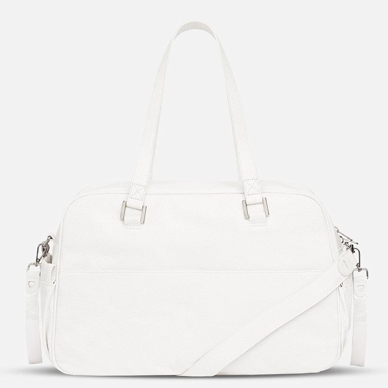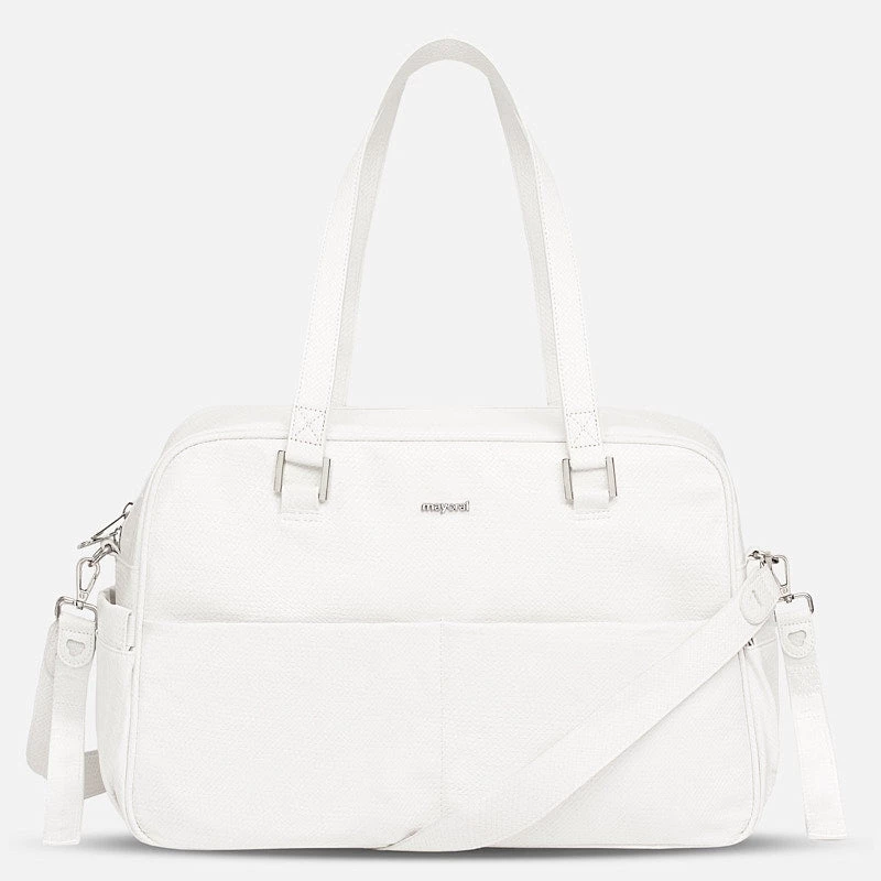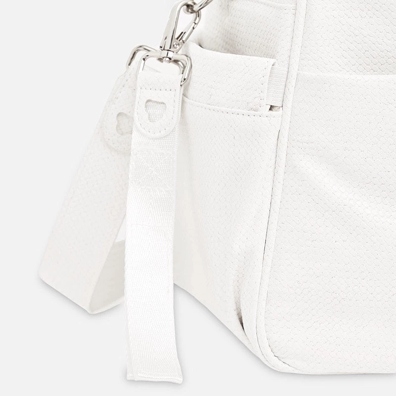 Modern leatherette exterior. Charming bag for baby used to store their essential accessories. This is a practical, fun addition to complete any look. Includes hanging straps to attach onto the pram and another long strap so that the bag can be used as a shoulder bag too. Both of these straps are detachable. Dimensions: 29 x 47 x 17 cm.