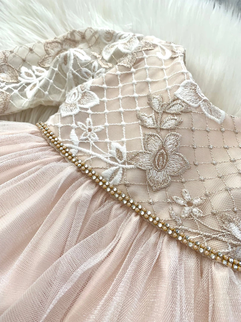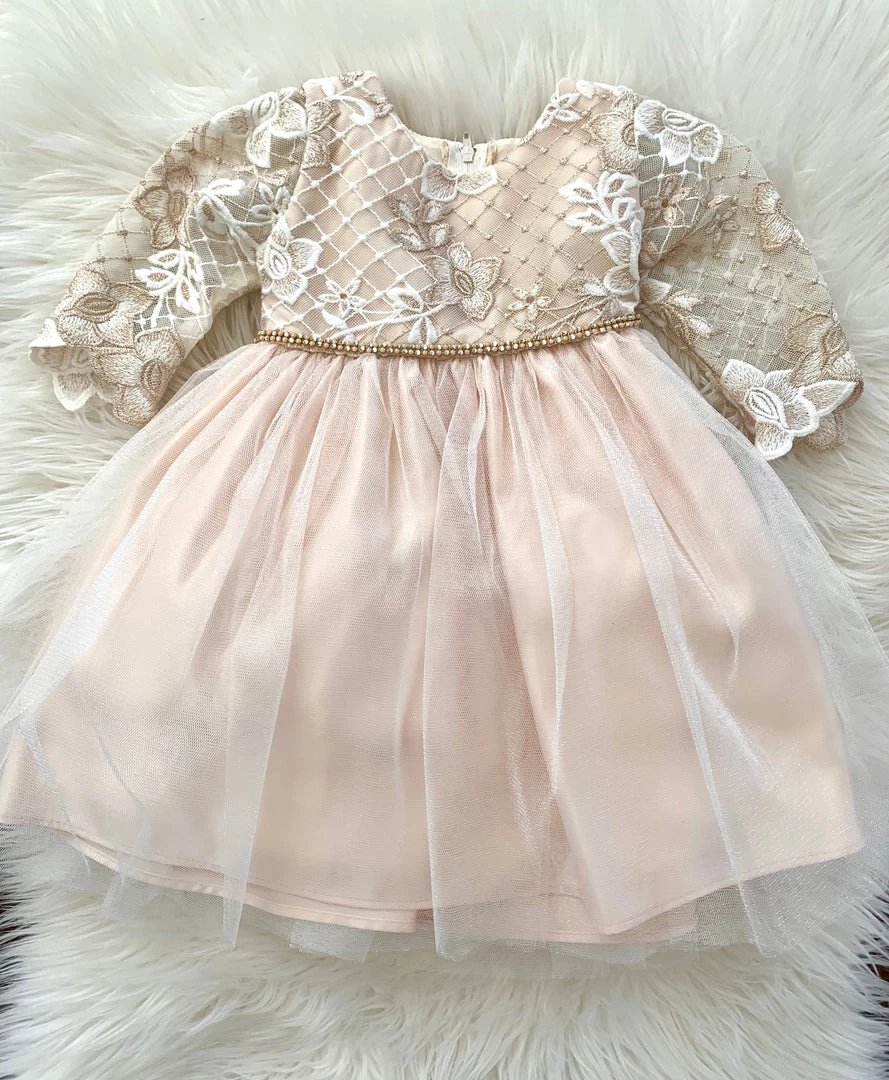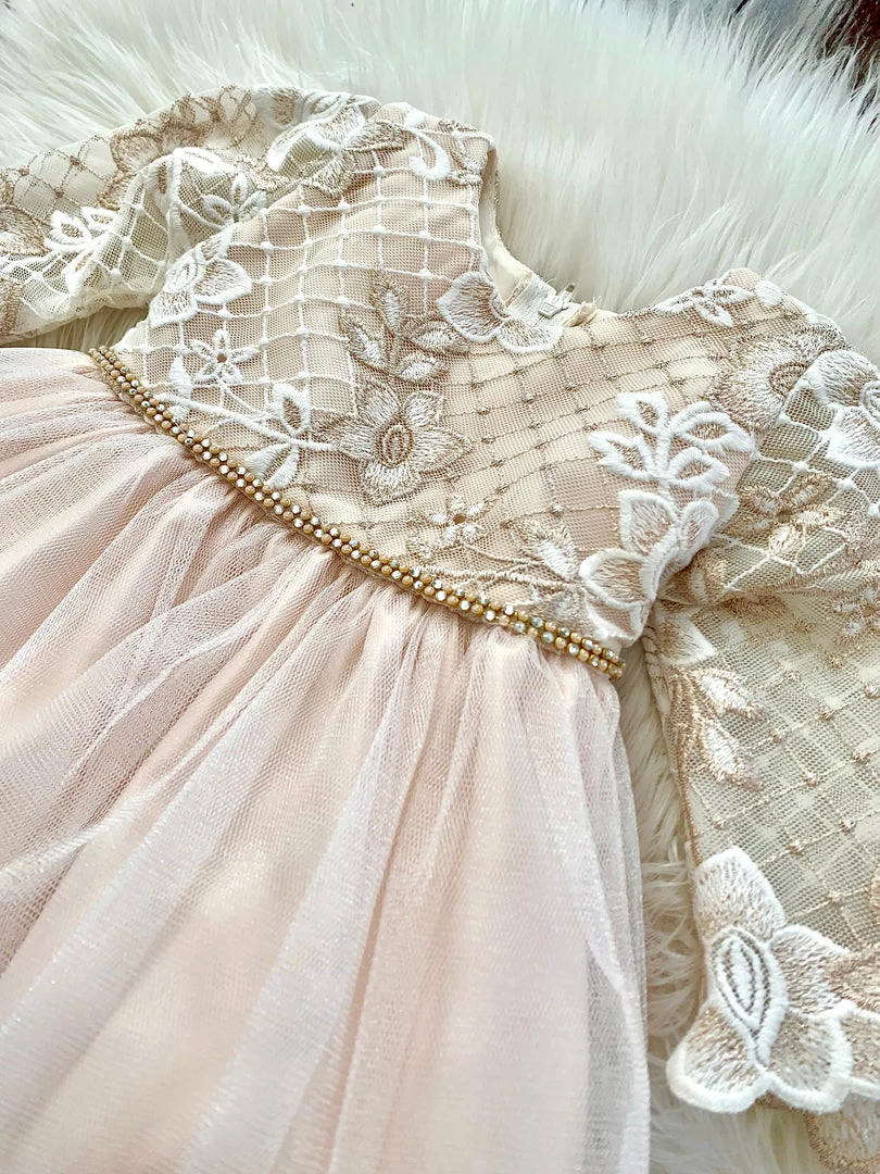 Stunning Champagne Long Sleeve Lace Baptismal Dress embellished with diamonds and floral lace!