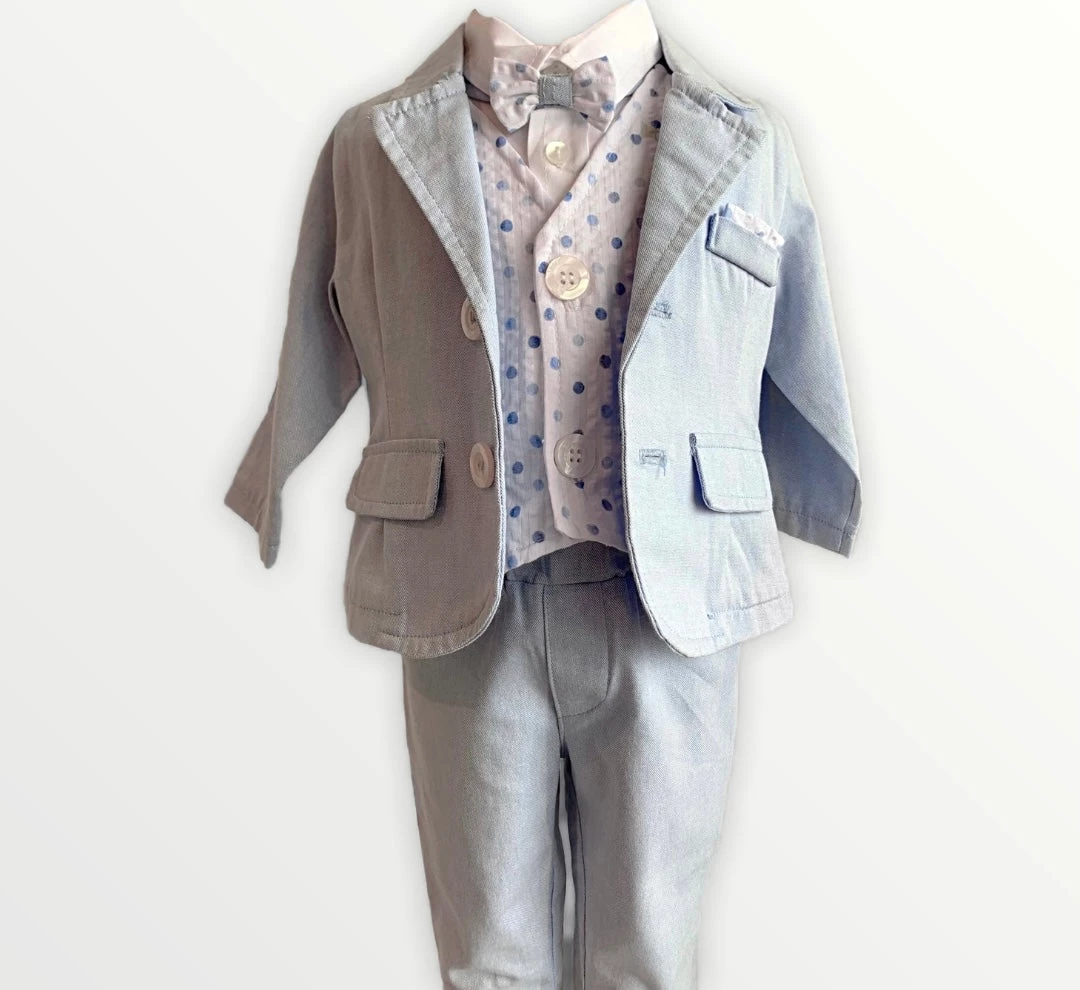 Outfit includes pants, dress shirt, vest, jacket, and bow tie.