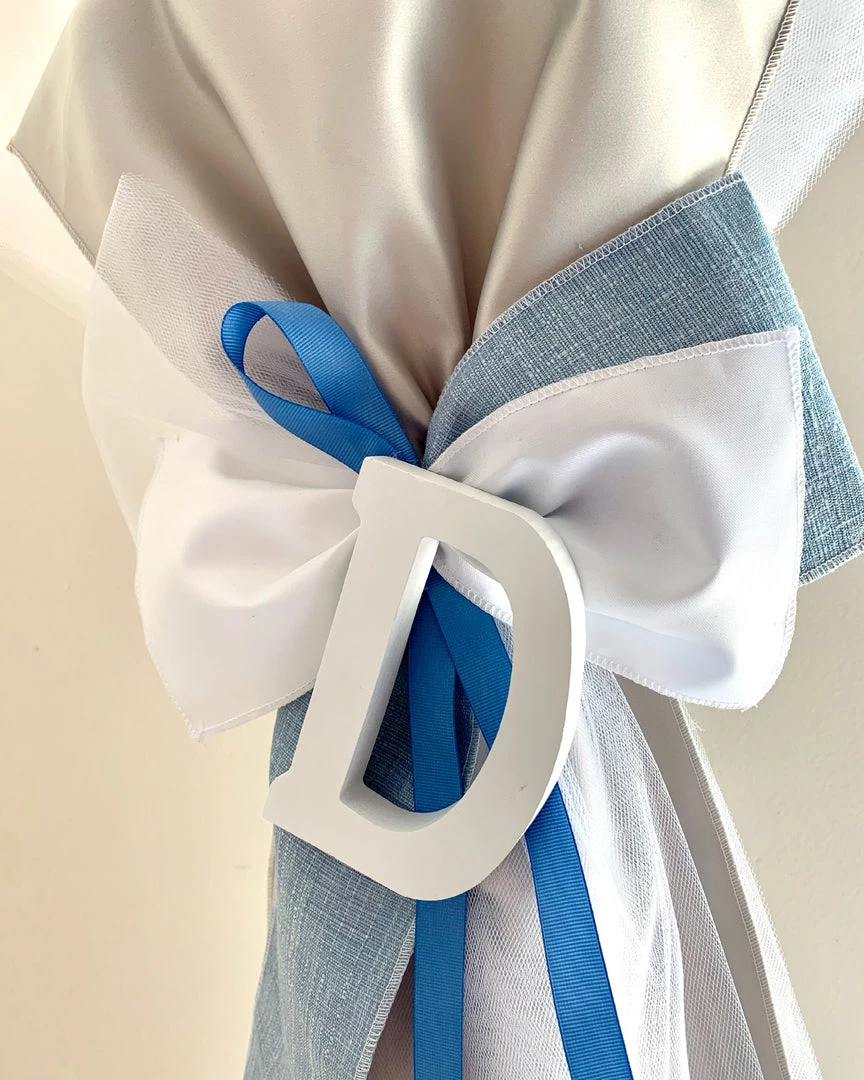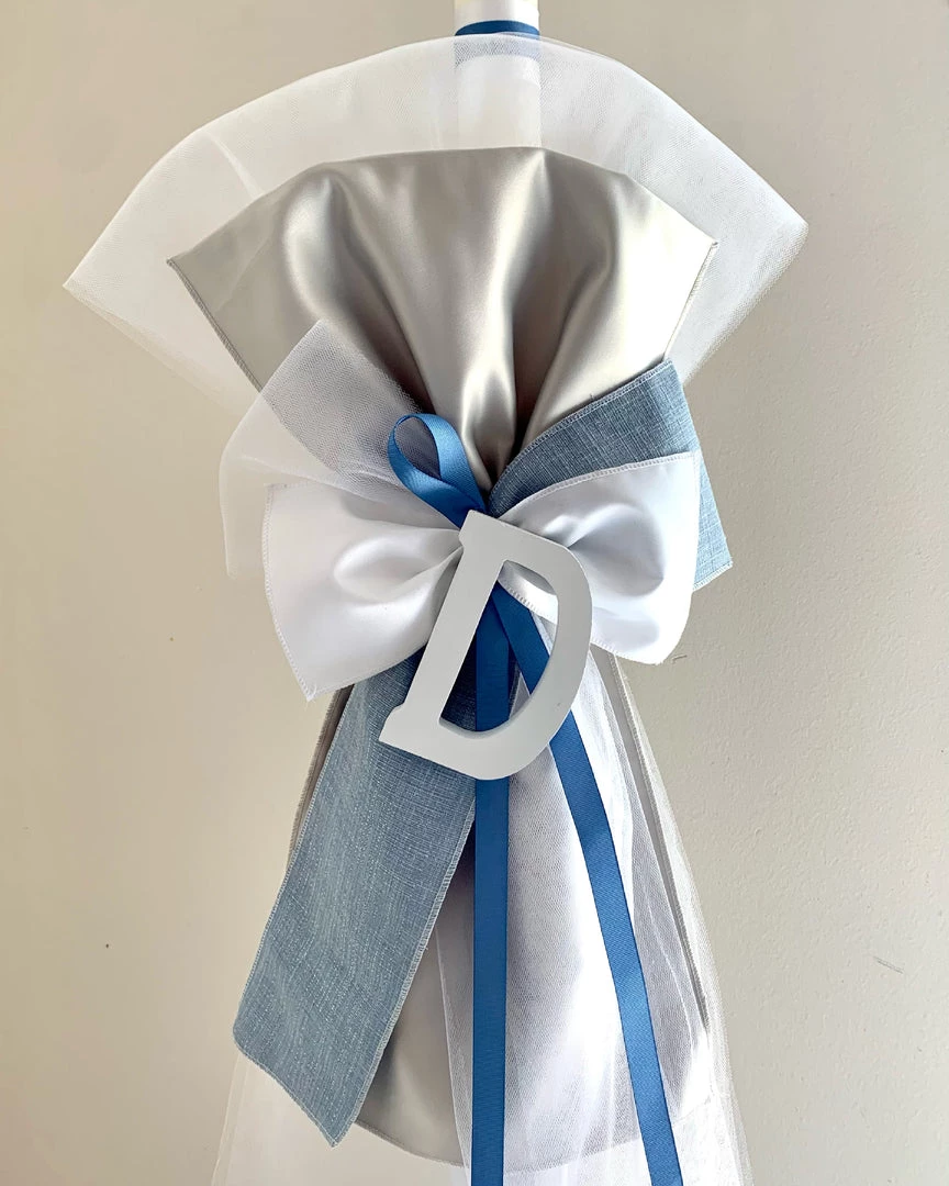 Blue and Silver Upright Bow Personalized Lambatha on 3ft candle. Price shown is per candle (1).