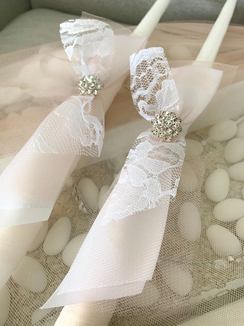 Blush pink and Lace 2 small 18′ candles . Price shown is for two (2) decorated candles