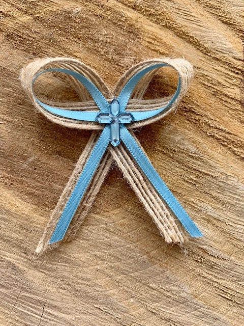 Martyiko includes burlap ribbon, thin baby blue ribbon, and baby blue cross.
