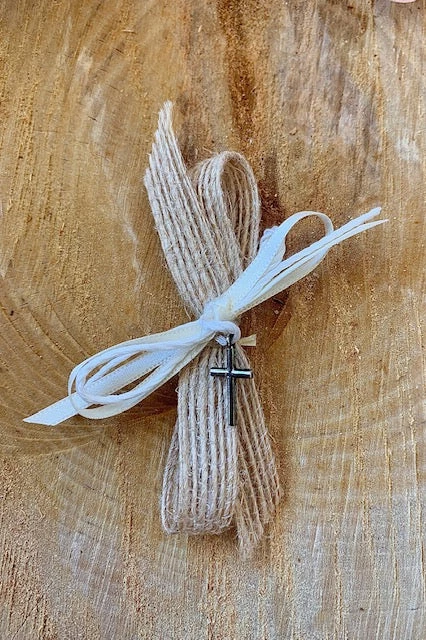 Martyiko includes burlap ribbon, white thin ribbon, and silver cross.
