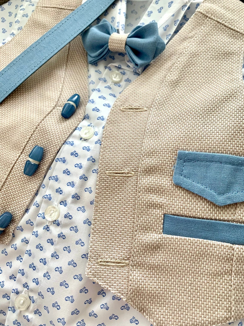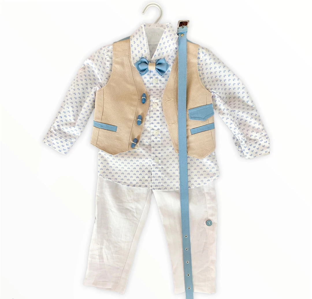 Both Sleeves and Pants can be rolled up to made into shorts and t-shirt. Baptismal Suit comes with long sleeve shirt, vest, pant, bow tie, and belt.