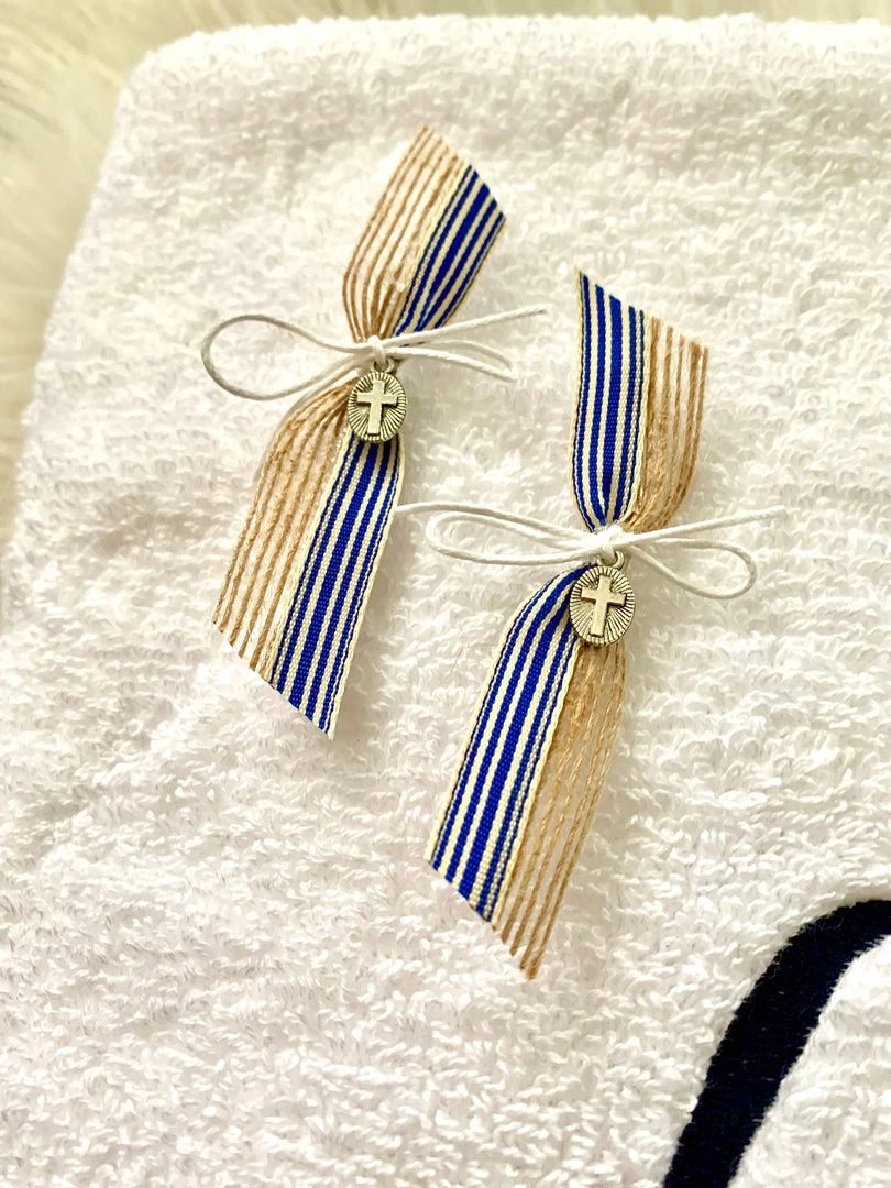 Martyiko includes burlap ribbon, nsvy striped ribbon, thin whote cord, and silver cross.