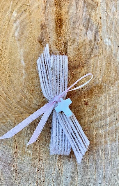 Martyiko includes burlap ribbon, baby pink thin ribbon, and white pearl cross.