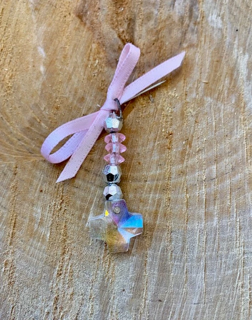 Martyiko keychain includes baby pink thin ribbon, crystal cross, three baby pink beads, and three silver beads.