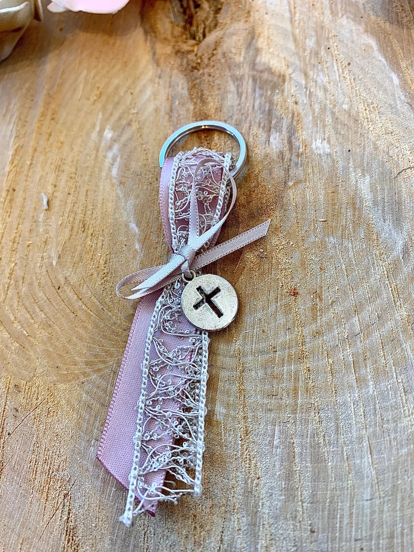 Martyika keychain includes rose gold ribbon, rose champagne lace overlay, rose gold thin ribbon, and silver circular cross.