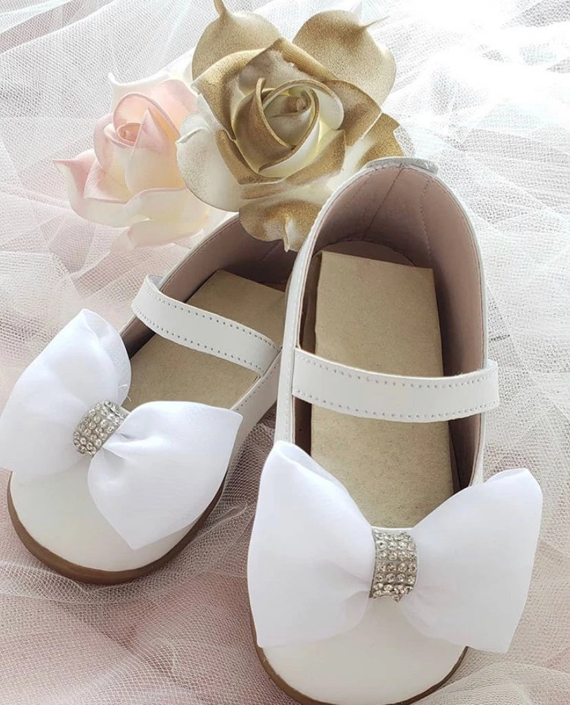 KaterinasDesigns Girls Baptismal White Leather Bow Walking Shoe