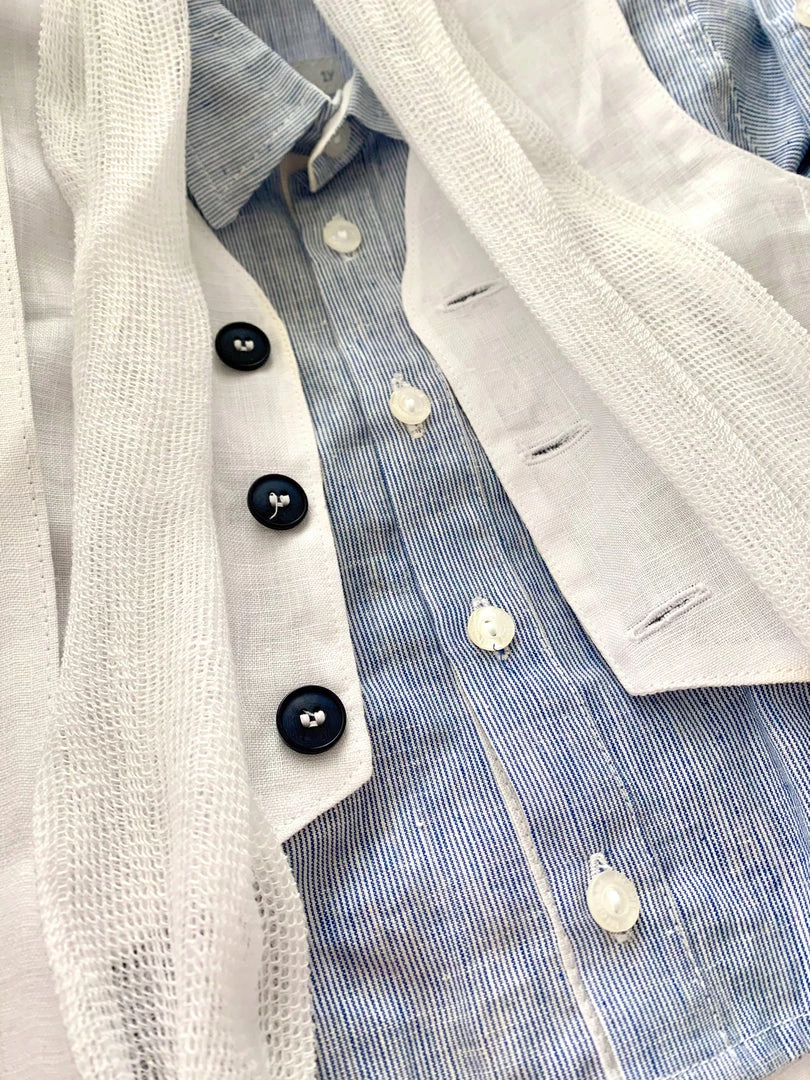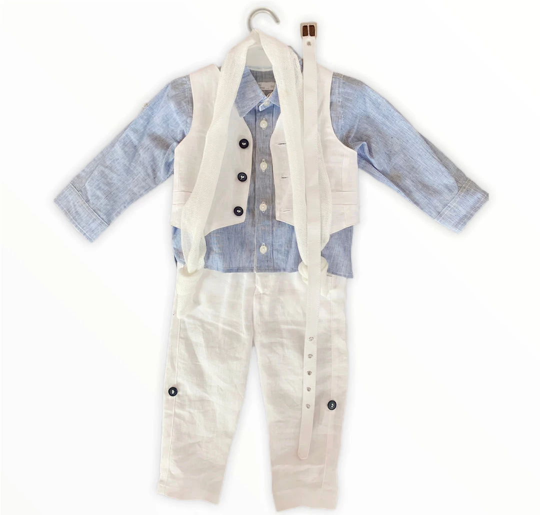 Both Sleeves and Pants can be rolled up to made into shorts and t-shirt. Baptismal Suit comes with long sleeve shirt, vest, pant, bow tie, belt, and navy suspenders.