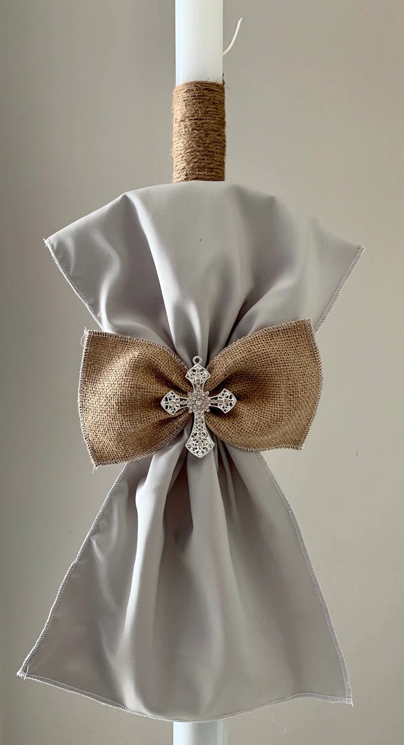 Grey Burlap Upright Bow Crystal Cross Lambatha on 2ft candle. Price shown is per candle (1)