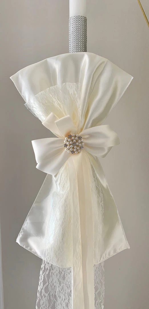 Ivory and Lace Upright Bow Lambatha on 4ft candle. Price shown is for 2 candles.