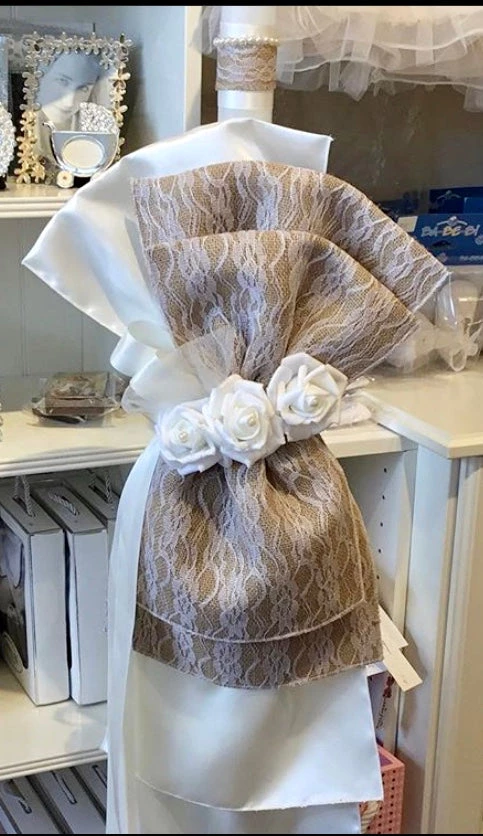 Lace Burlap Rosette Lambatha on 3ft candle. Price shown is per candle (1)