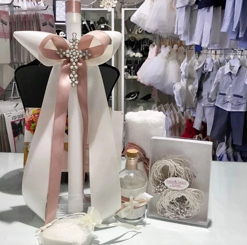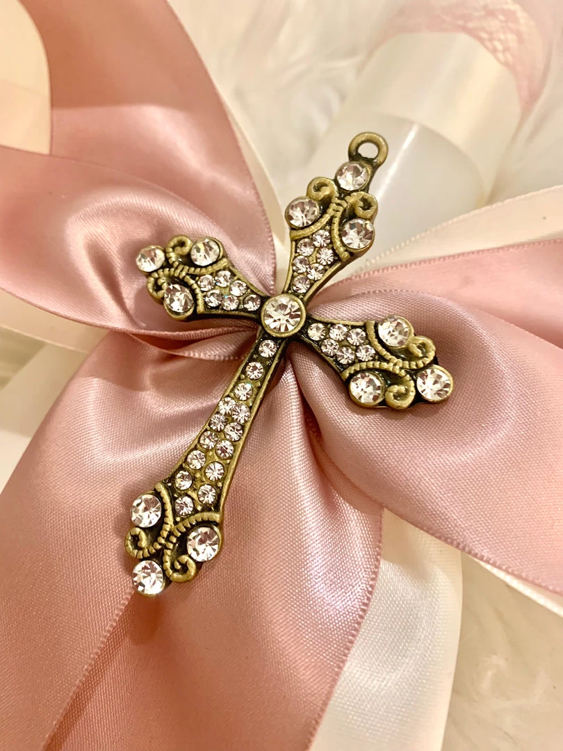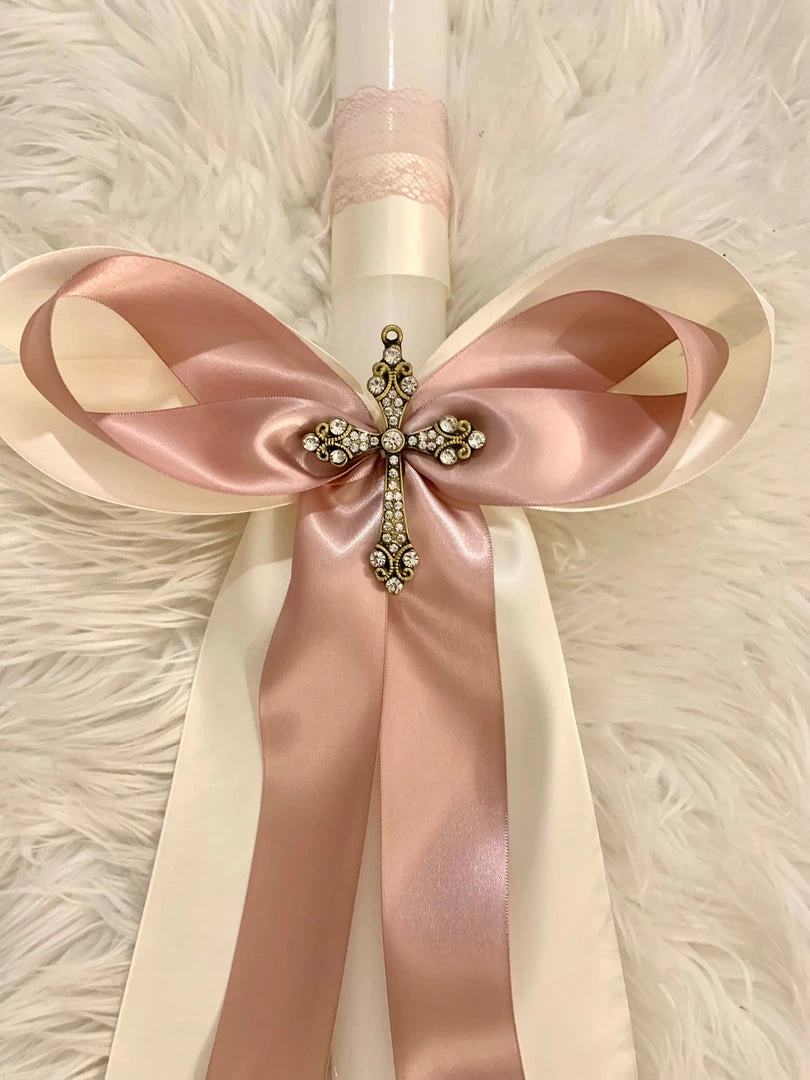 Rose Gold Cross Lambatha on 2ft candle *PEARL CROSS SOLD OUT, WILL BE REPLACED WITH GOLD CRYSTAL CROSS IN FOLLOWING PHOTOS*