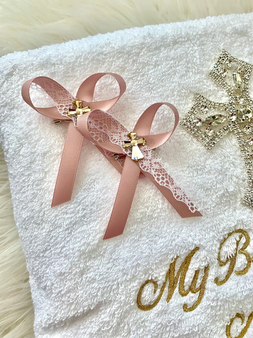 Martyiko includes rose gold ribbon, white lace ribbon, gold/champagne crystal cross, and pin.