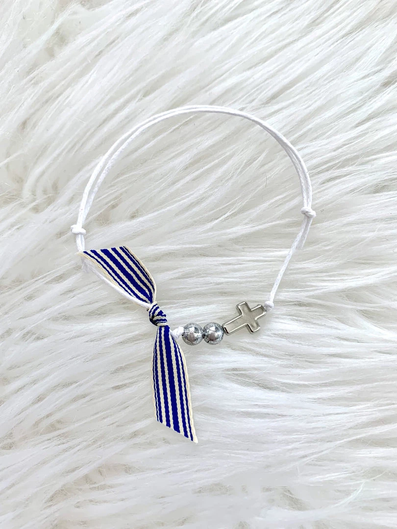 Martyiko includes 2 silver beads, 1 silver cross cross, and navy striped ribbon.