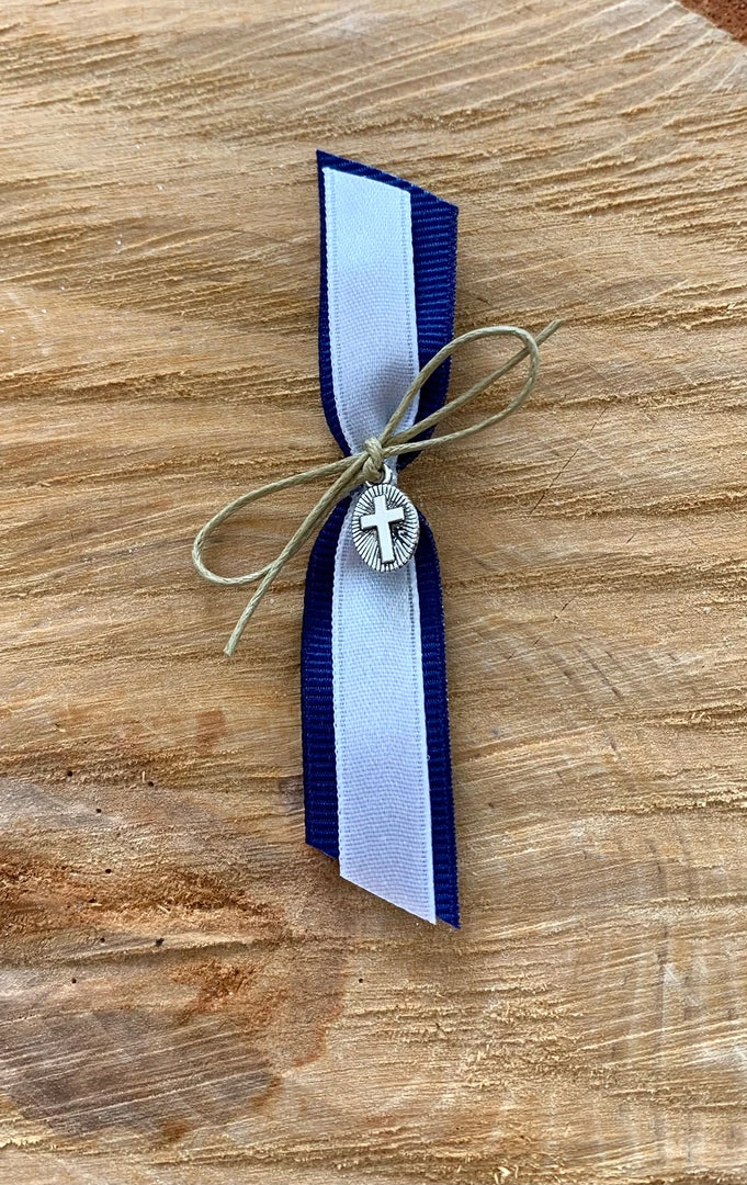 Martyiko includes navy ribbon, white ribbon, gold cord, and silver cross.