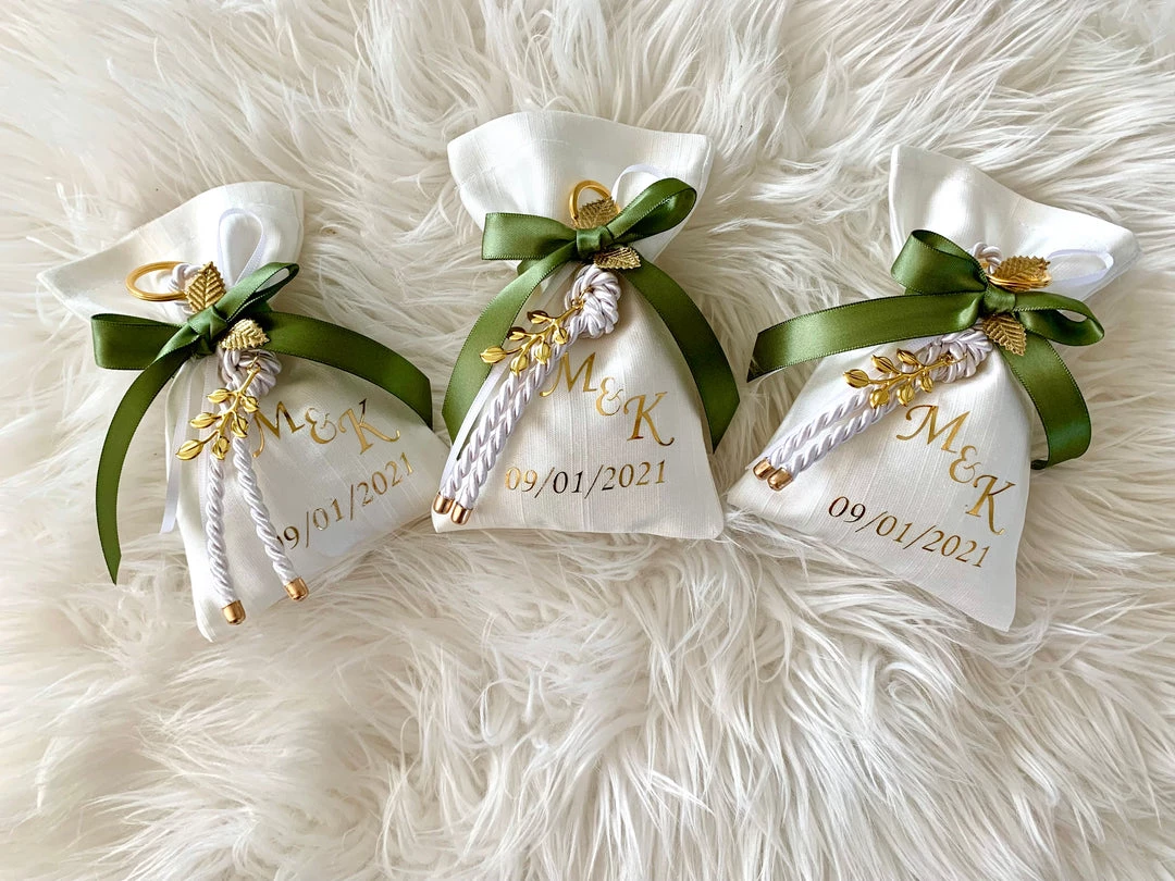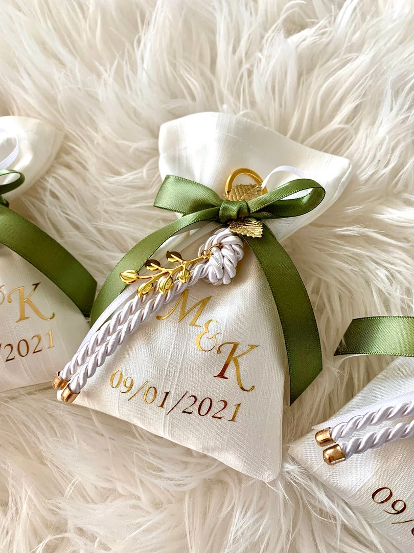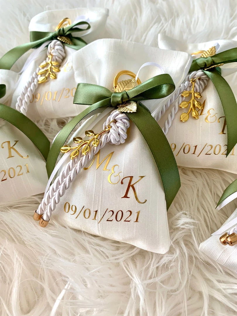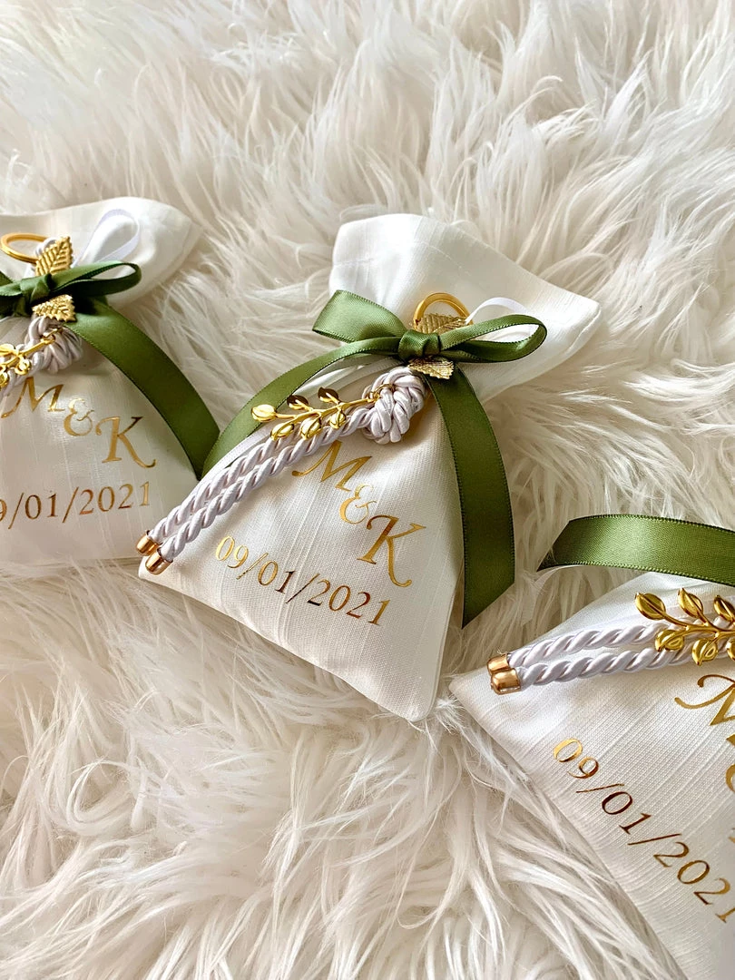 Bonbonnieres include five (5) Jordan Almond, personalization, gouri with gold olive vine, ribbon, and pouch.