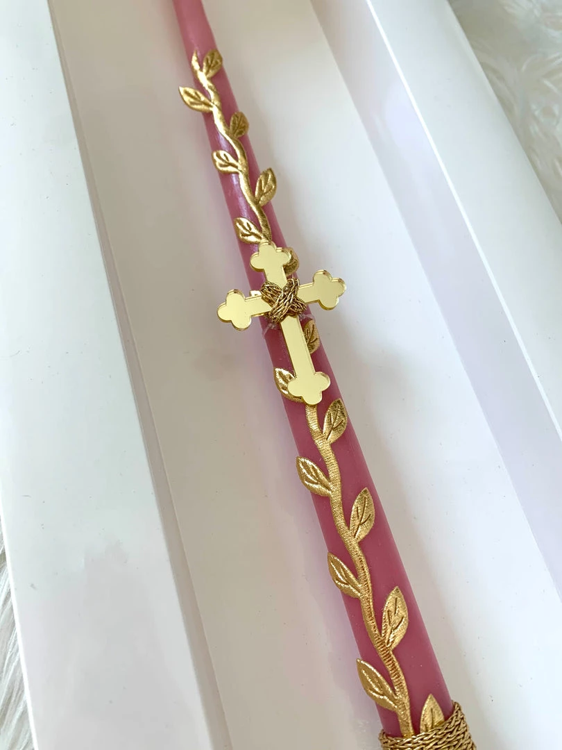 Gold Acrylic Cross Vine Leaf Easter Candle. Hand Made. Custom Made.