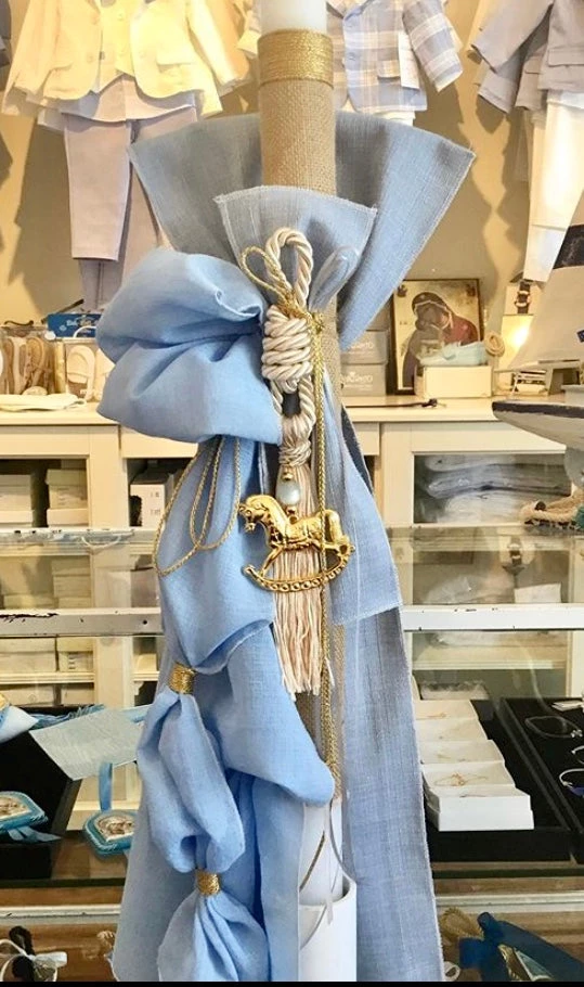Grey and White Cross Upright Bow Lambatha on 3ft candle. Price shown is per candle (1)
