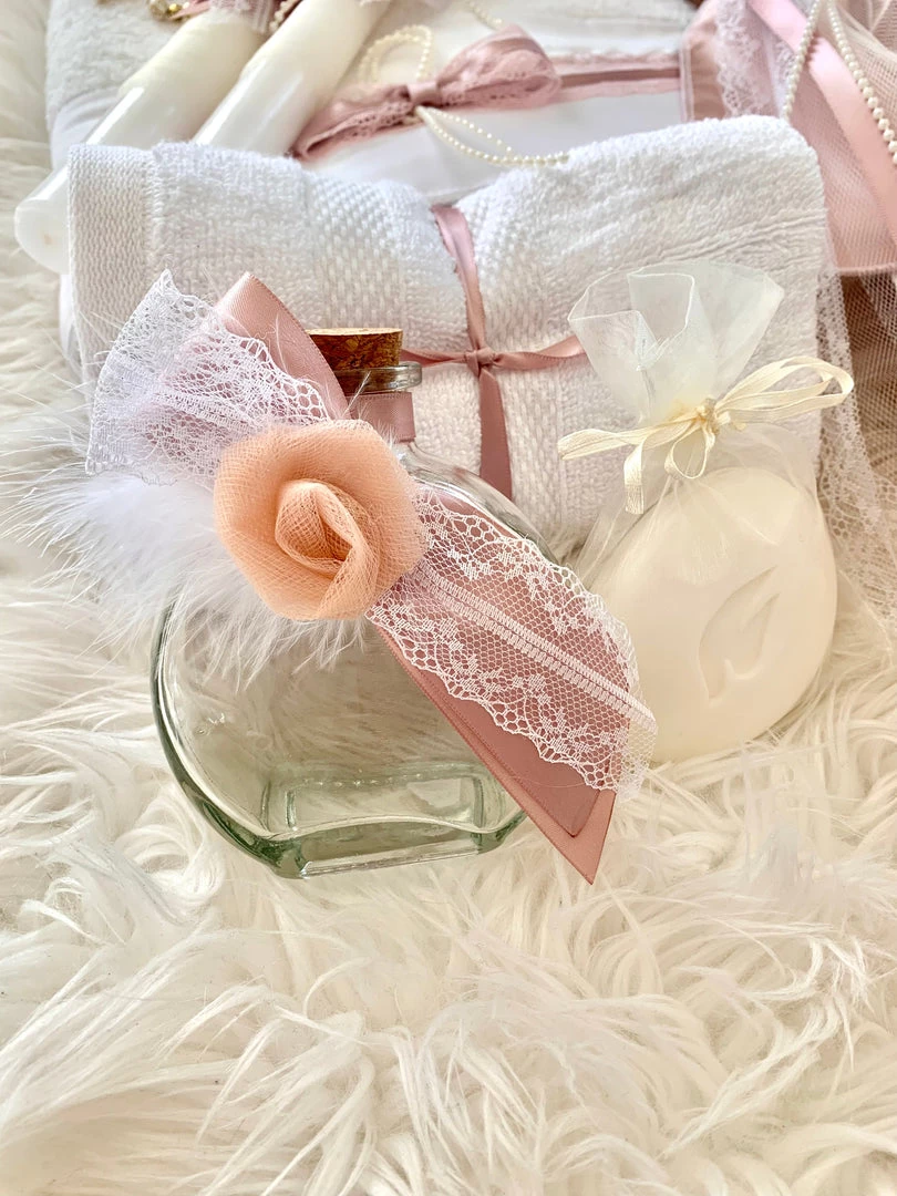 Oil bottle Set includes one (1) Oil Bottle decorated, one (1) hand towel, and one (1) Hand Soap.