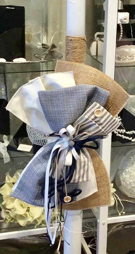 Striped Burlap Upright Bow Lambatha on 3ft candle. Price shown is per candle (1)