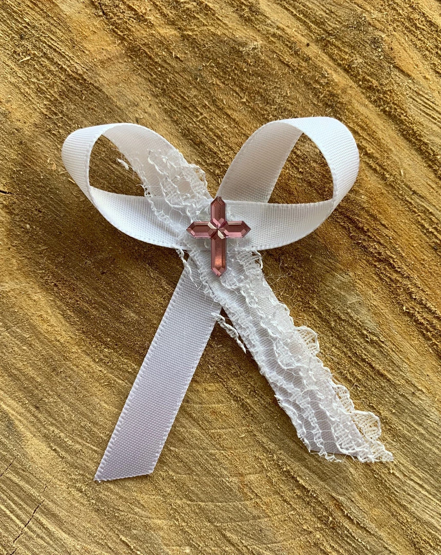 Martyiko includes white ribbon, white lace ribbon, and pink cross.