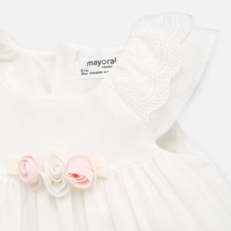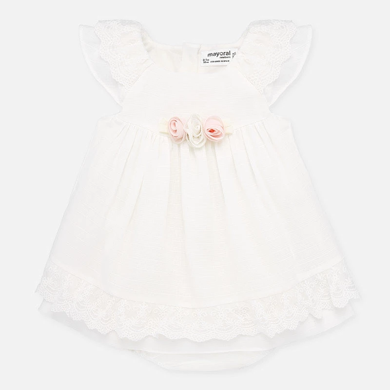 Mayoral 2 piece white short sleeve dress imported from Spain. Dress includes panty. Panty with elastic waistband for a better fit. Made from soft elasticated cotton fabric.