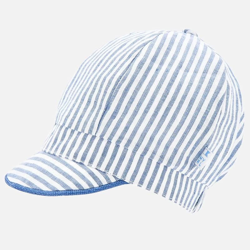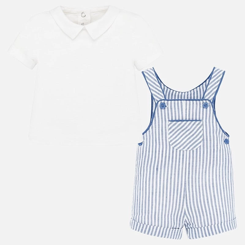 3 piece blue striped summer jumper. Short sleeved Shirt for with collar. Snap button fastening on the back to allow the garment to be put on easily. Made from 100% cotton fabric. Design with suspenders. Buttons to fasten. Fresh and contemporary fabric with linen. Upturned hem. Functional front pocket.