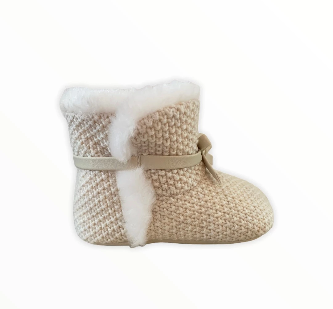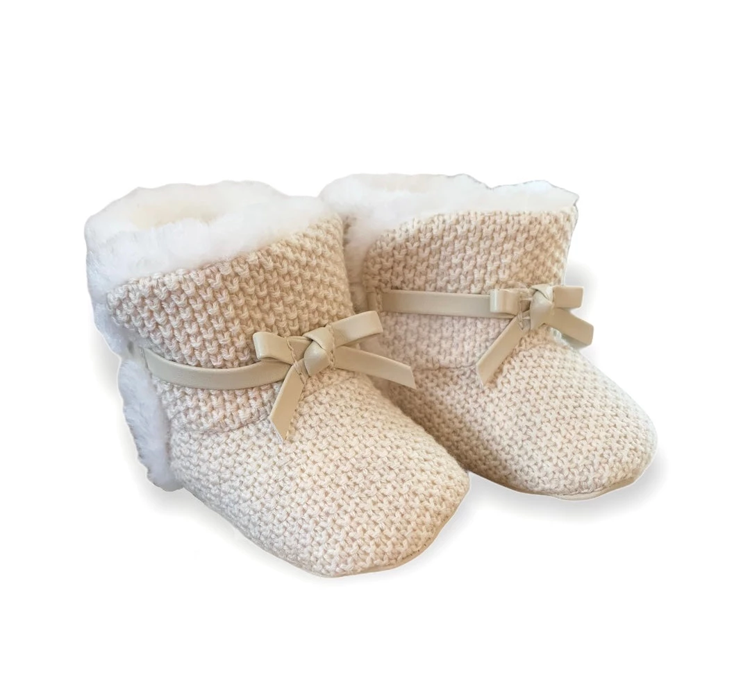 Delicate booties that will protect your baby’s feet. Shoes with faux fur lining which provides better comfort and thermal insulation. Decorative elements: decorative strips, bow applique. This item comes presented in a box from the Newborn collection, ideal to be given as a gift on special occasions