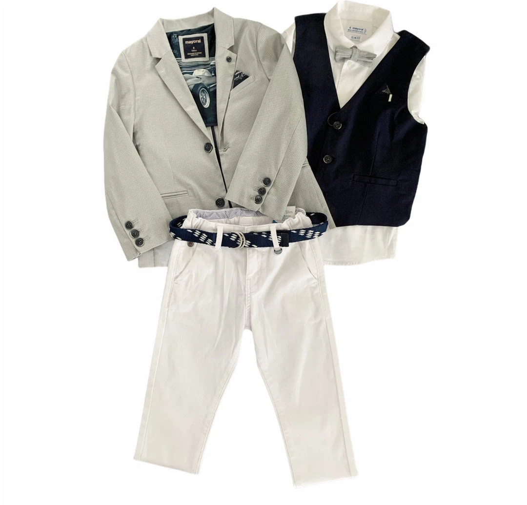 Suit includes Jacket, Pant, Vest, Long Sleeve Shirt, Bow Tie, and Belt.