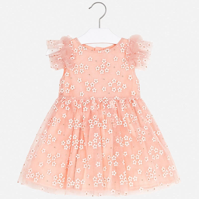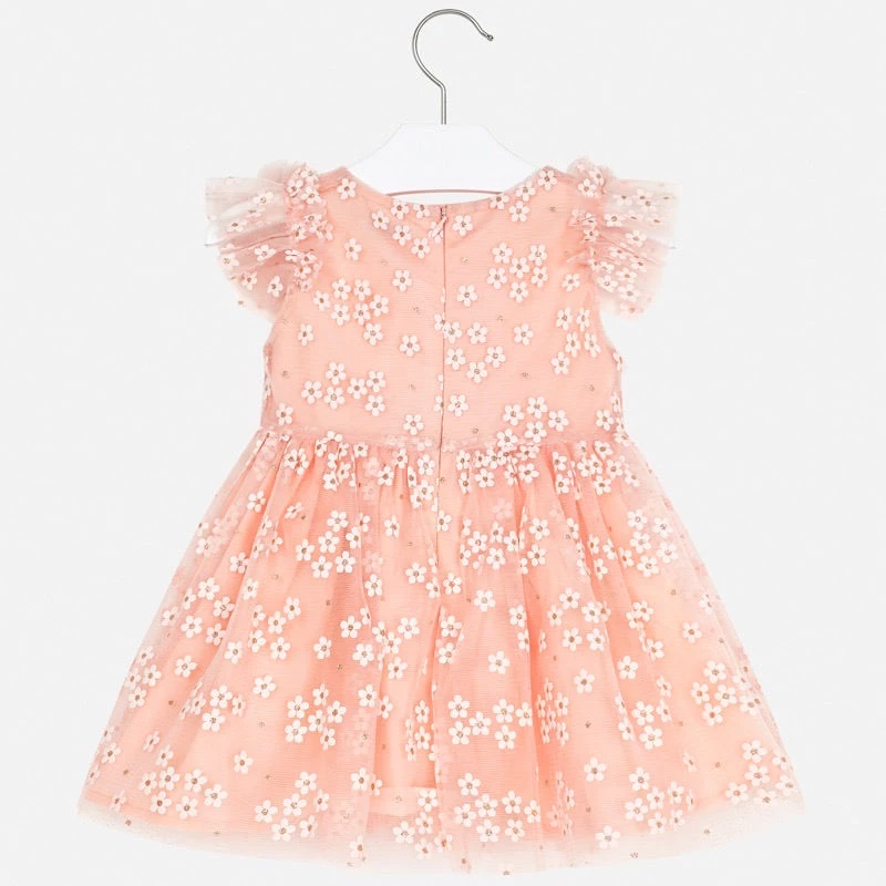 Peach flower tulle dress made with lightweight, sheer tulle fabric. Ruffled design. Outside Fabric: 85% Polyester,15% Polyurethane. Interior Lining: 80% Polyester, 20% Cotton. Imported from Spain
