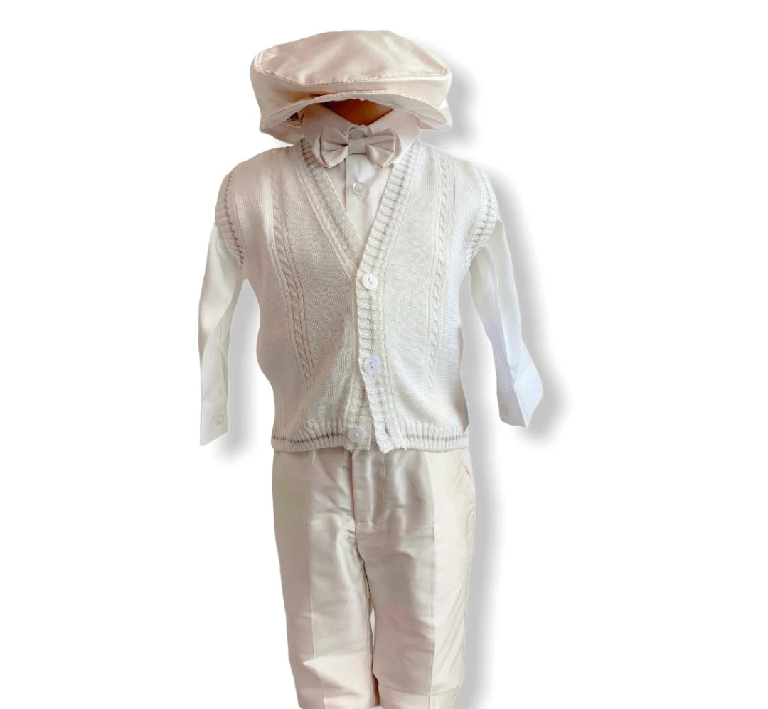 Boys Italian Silk 5 piece outfit imported from Italy. Outfit includes silk pants, dress shirt, vest, bow tie and silk hat.