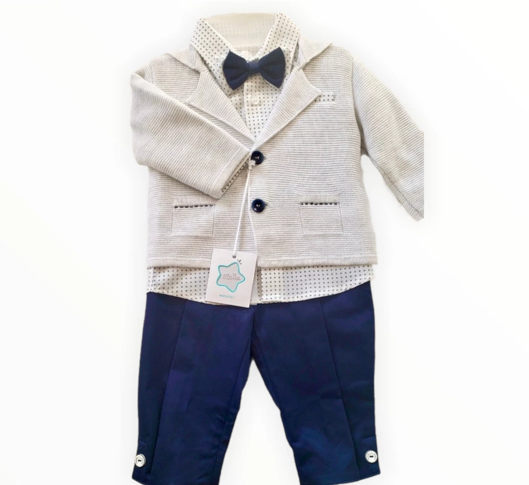 Outfit includes pants, dress shirt, cardigan, and bow tie.